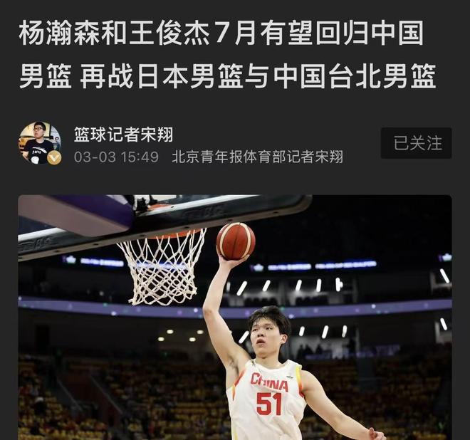 就在今晚,中国男篮传来第三大好消息!不止杨瀚森、王俊杰或归队