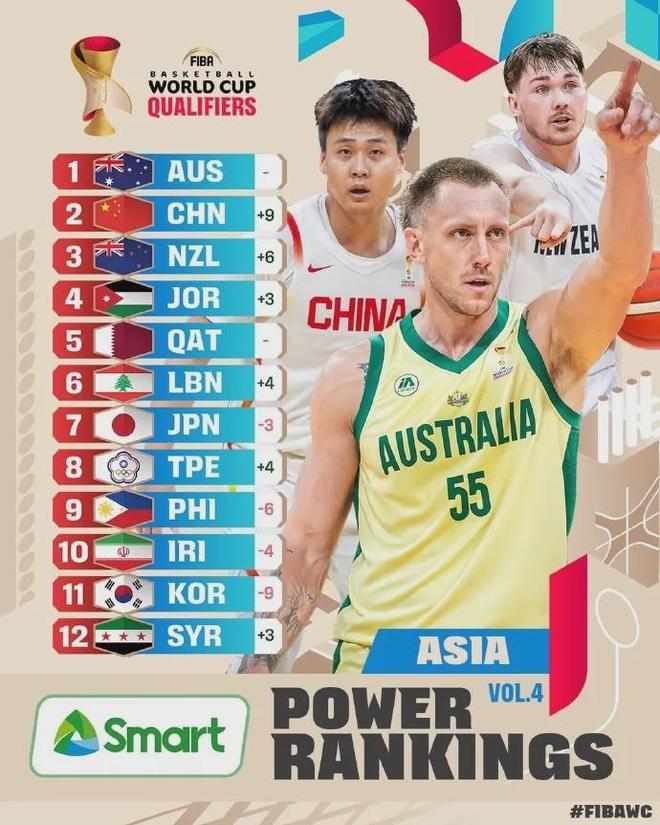 世预赛首个窗口期,中国男篮76-80,以及76-90不敌韩国男篮,导致在亚大区实力榜排名倒数第二,仅好于中国台北队,澳大利亚、韩国和日本分列前三。
