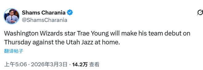 北京时间3月3日,据名记Shams报道,华盛顿奇才队控球后卫特雷-杨预计将在周五对阵犹他爵士的比赛中完成新球队首秀。特雷-杨自2025年12月28日起因膝盖与股四头肌伤势一直缺阵。他是在2026年2月交易截止日前被交易至奇才队的。